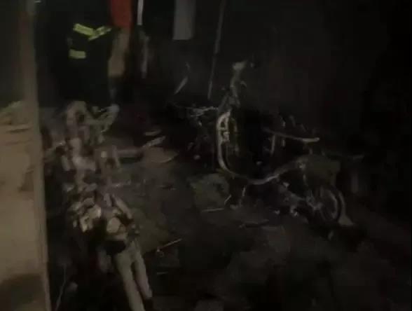 事發(fā)樓道有多輛電動(dòng)車已經(jīng)被燒得只剩下架子