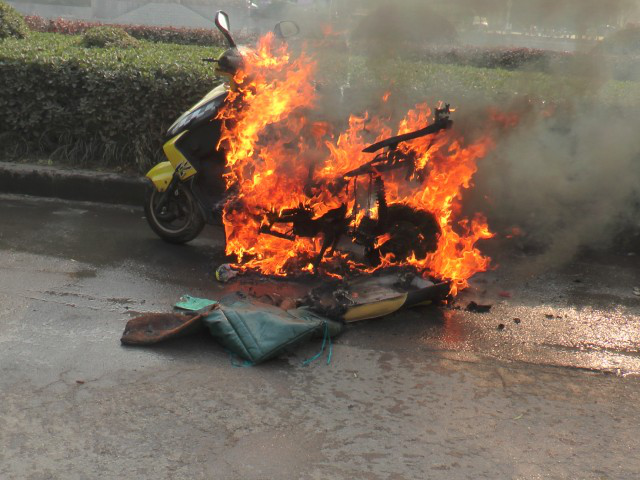 2、車主為了防盜,將充電器鎖在車鞍里,不能散熱,也是會(huì)容易引起電車起火;